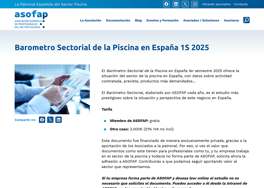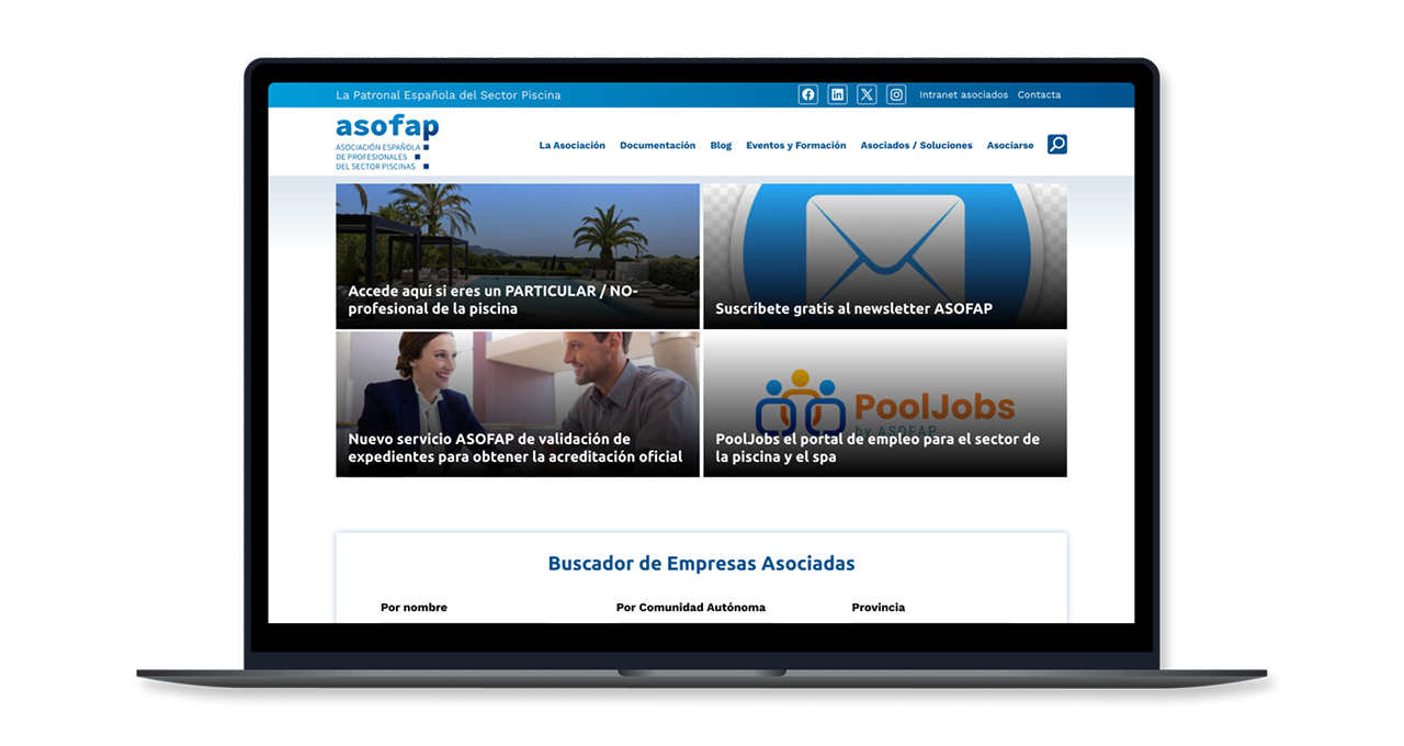 La navegació és intuïtiva, amb un menú superior que dona accés directe a les principals àrees del lloc. També inclou un cercador per localitzar empreses associades per nom o ubicació. El lloc web està optimitzat per a dispositius mòbils, garantint una experiència fluida i accessible. En conjunt, combina un enfocament professional amb un disseny atractiu i funcional per connectar els actors del sector de les piscines.