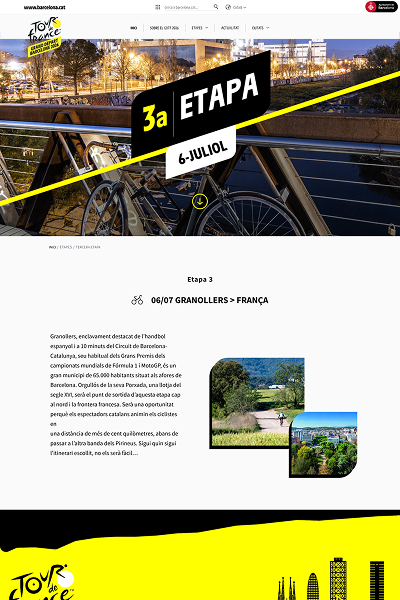 The Letour Barcelona website design is modern and visually appealing, with a color palette reflecting the identity of the Tour de France and the host city. The typography is clear and readable, facilitating navigation and content reading. The homepage features sections such as About GDTF 2026, stages, news, and cities, allowing users to easily access relevant information.