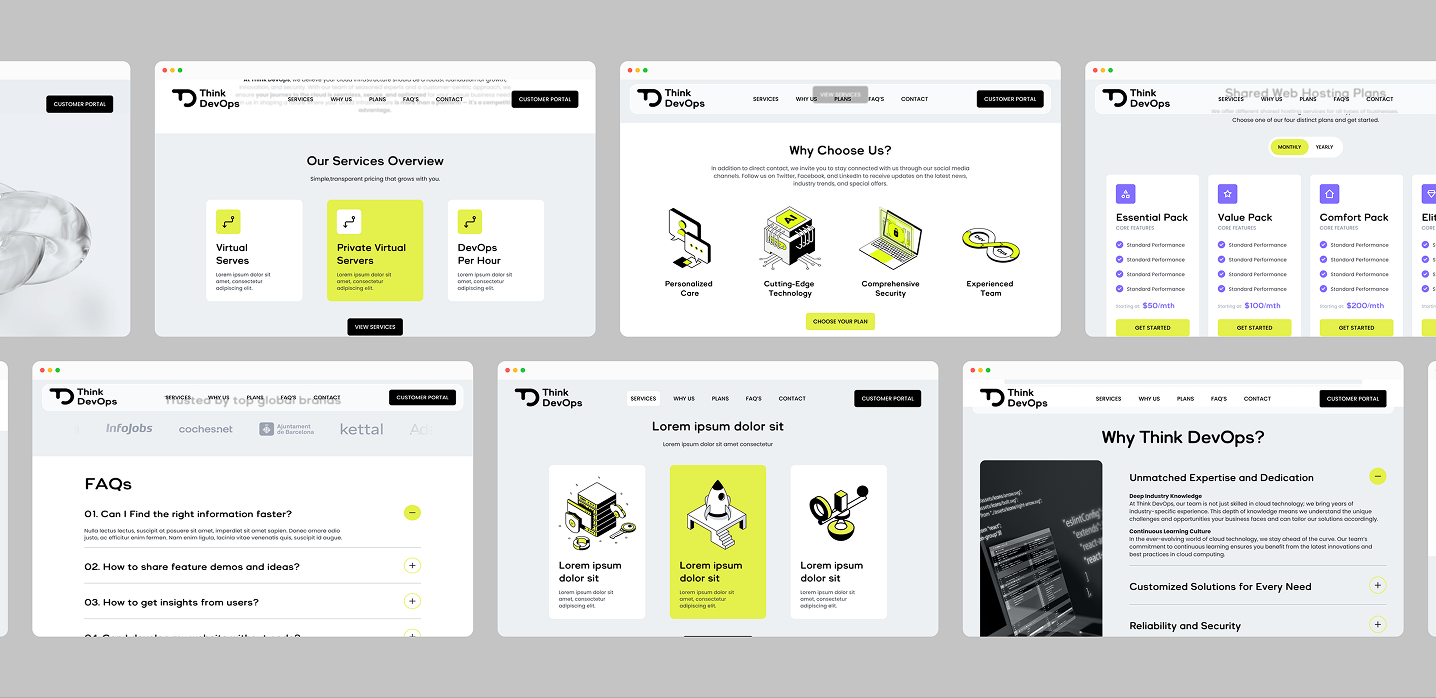 The process began with defining the branding, creating a logo representing ThinkDevOps’ technological spirit and a visual system supported by typography and colors conveying strength and modernity. Simultaneously, a UI component library was developed to provide consistency and scalability across the brand’s digital ecosystem.