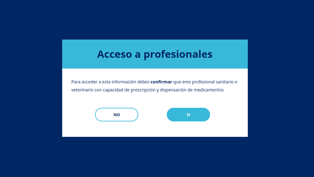 Para esto mostramos una modal que te pregunta si eres profesional: apretando si se oculta la modal, apretando no va a la página anterior en el sitio si hubo o a la página principal.