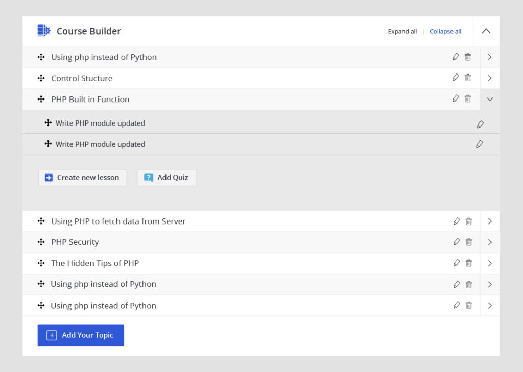 La elaboración de cada curso es simple, sobre todo si se tiene el material didáctico bien preparado. Es tan fácil como ir estructurando los cursos en un índice, en el que simplemente hace falta ir arrastrando lecciones y temarios a partir de las cápsulas didácticas, de modo más o menos granular. También, se puede hacer lo mismo, con los exámenes disponibles.
