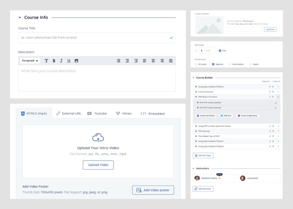 La base principal de una plataforma LMS de e-learning es el fondo de materiales didácticos. Por lo tanto el primer paso que se deberá realizar es la introducción mínima del material didáctico en forma de cápsulas, lecciones y temas. La idea es tener a disposición un catálogo de contenidos para cuando toque estructurar los cursos. Estos contenidos se pueden añadir, vía un editor web, desde el panel de control de WordPress y en formato de texto enriquecido e imágenes como si fuera un documento de Word o Google Drive: cada plataforma cuenta con una variedad interesante de plantillas de introducción de contenidos que permiten subir contenidos con vistas y recursos diferentes, por ejemplo: multimedia: vídeos, audios o visores de pdf.
