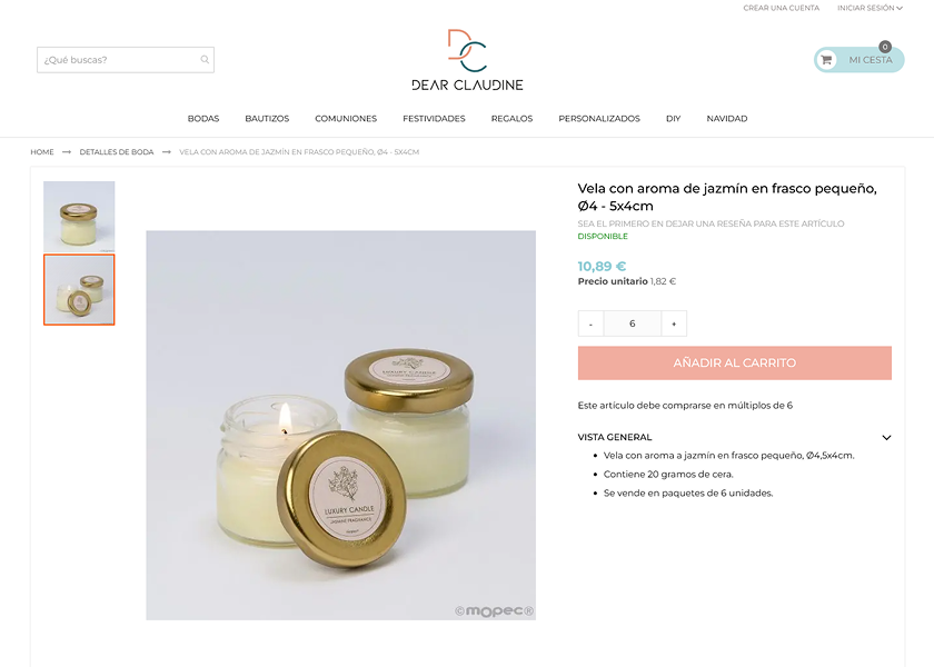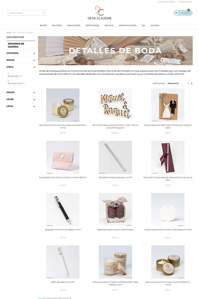 Dearclaudine es una tienda online española especializada en detalles y regalos personalizados para celebraciones como bodas, bautizos, comuniones, cumpleaños y festividades. Ofrece una amplia gama de productos que incluyen abanicos, alfileres, tazas, pashminas, cajas de cartón, imanes y libros de firmas. Además, permite la personalización de muchos de sus artículos, adaptándolos a las necesidades y gustos de cada cliente.