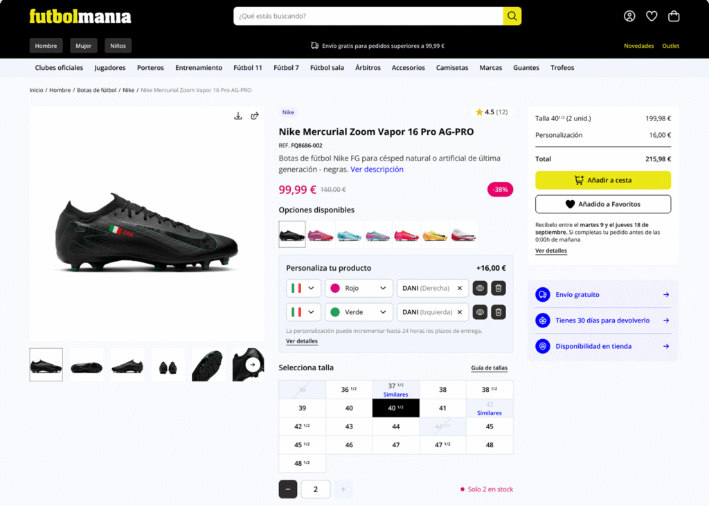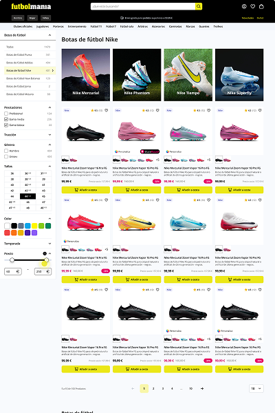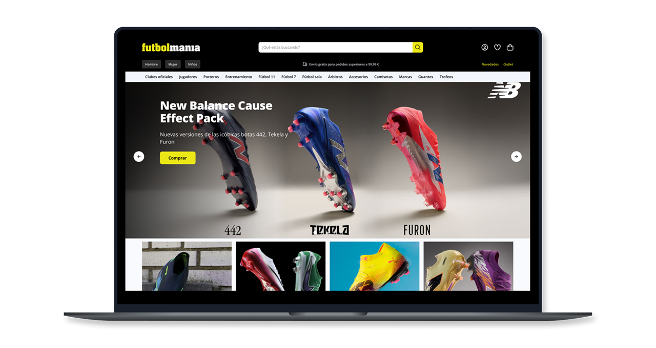 Futbolmania es una tienda de calzado, equipamiento, accesorios y ropa para fútbol y deportes relacionados, tanto para adultos como para niños. Catálogo amplio, sistema de filtros muy específico (superficie, gama, tipo de producto, talla, jugador), módulos de usuario/registro/pedidos avanzados y un sin fin de adaptaciones tanto frontend, backend e integraciones.