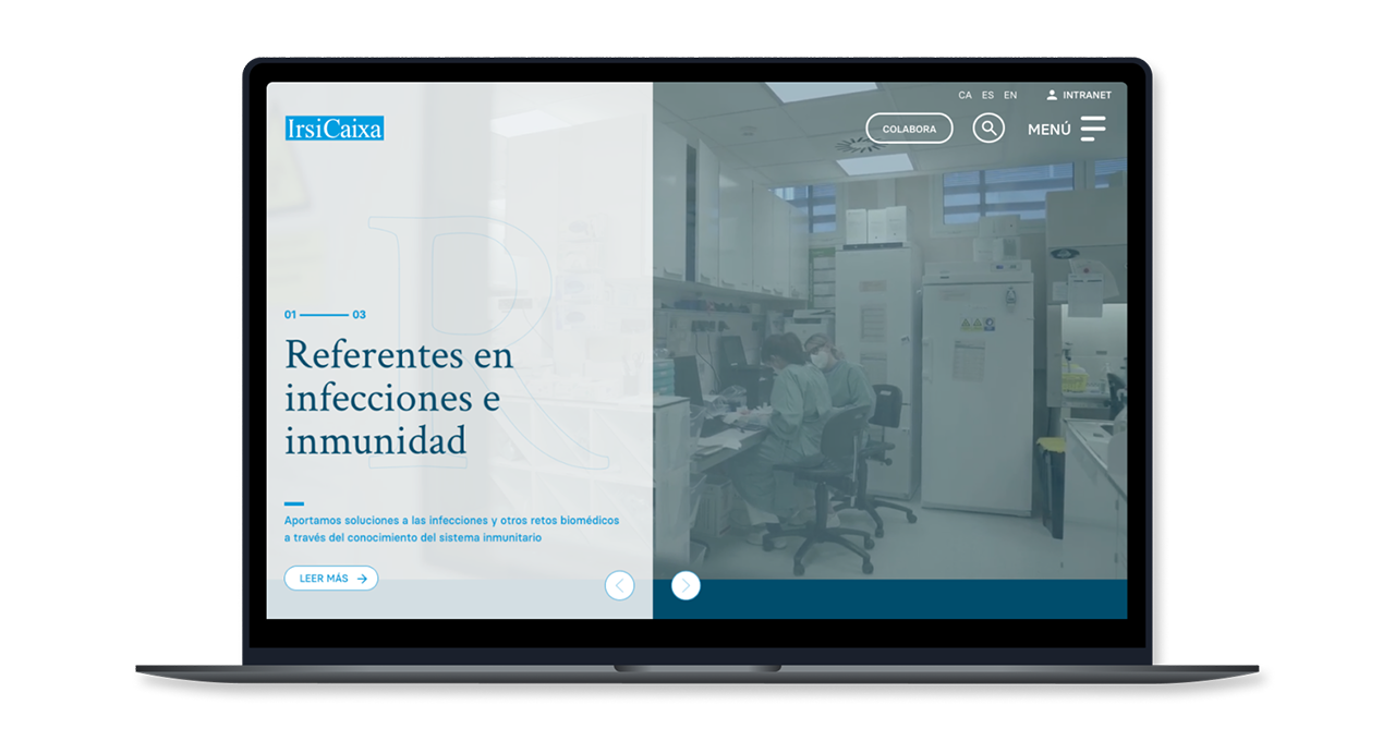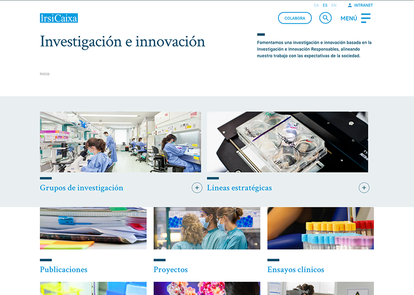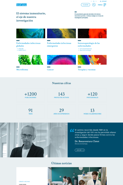La web de IrsiCaixa presenta un diseño moderno y funcional, con una paleta de colores sobria que refleja su carácter científico y profesional. La tipografía es clara y legible, y la estructura permite acceder fácilmente a información sobre investigación, grupos de trabajo, proyectos, estudios clínicos y oportunidades de colaboración.